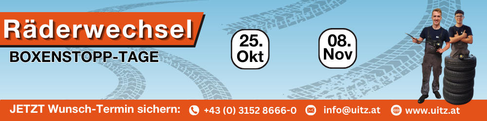 An gleich zwei Samstagen – dem 25. Oktober und dem 8. November – öffnen wir unsere Werkstatt-Tore und machen euch im Halbstunden-Takt fit für den Winter. Unsere UITZ Serviceprofis wechseln eure Reifen so schnell und zuverlässig, dass ihr euch fast wie bei der Formel 1 fühlt – nur ohne Stress, ohne Boxenfunk und garantiert mit einem freundlichen Lächeln.